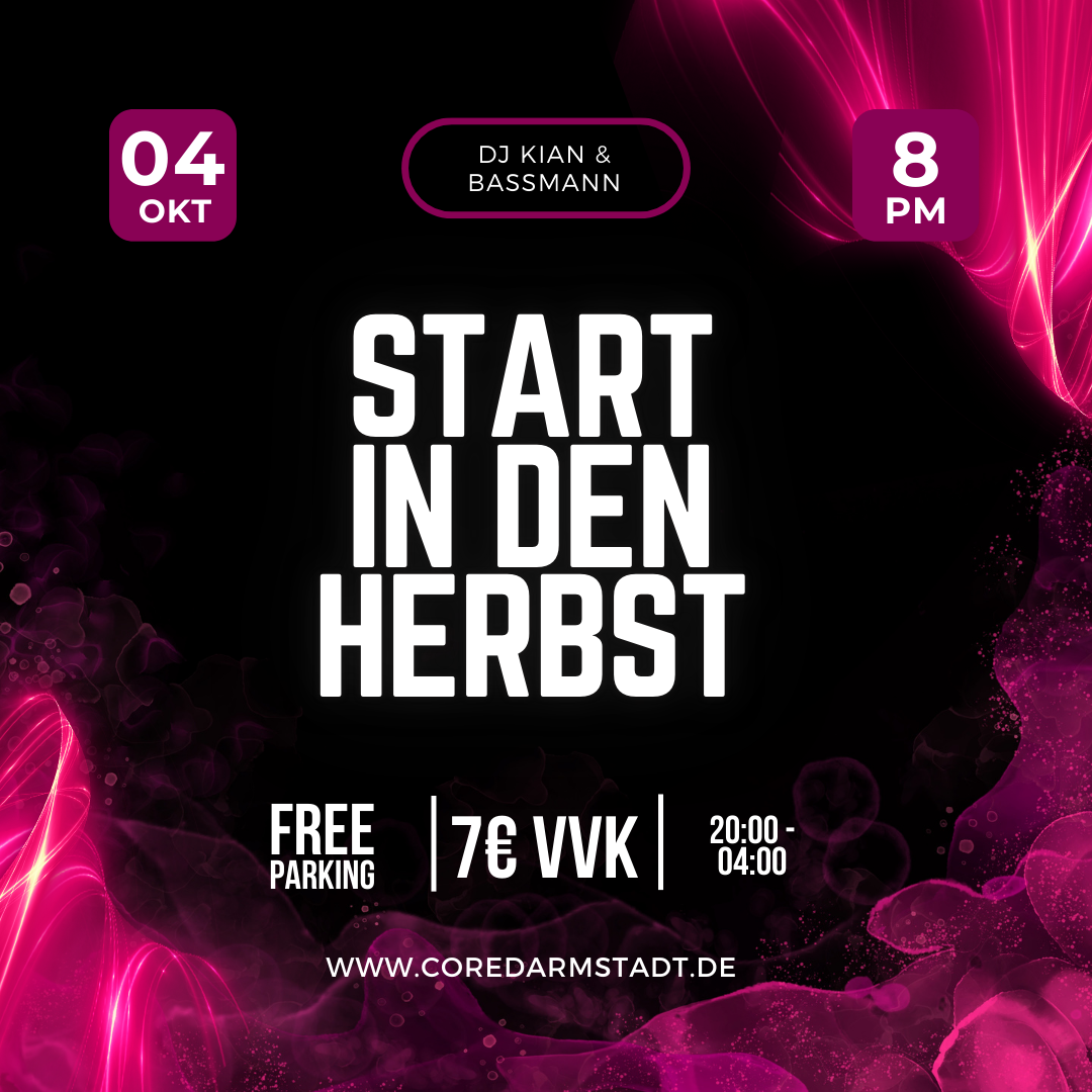Start in den Herbst Oktober 4, 2025 @ 8:00 p.m. - Oktober 5, 2025 @ 4:00 p.m. 20:00 - 01:30: DJ KIAN (R&B, Party, House) 01:30 - 04:00: BASSMANN (Techno)